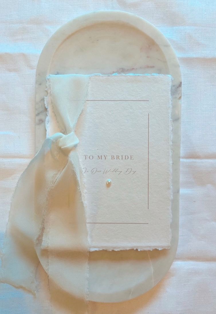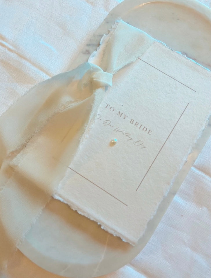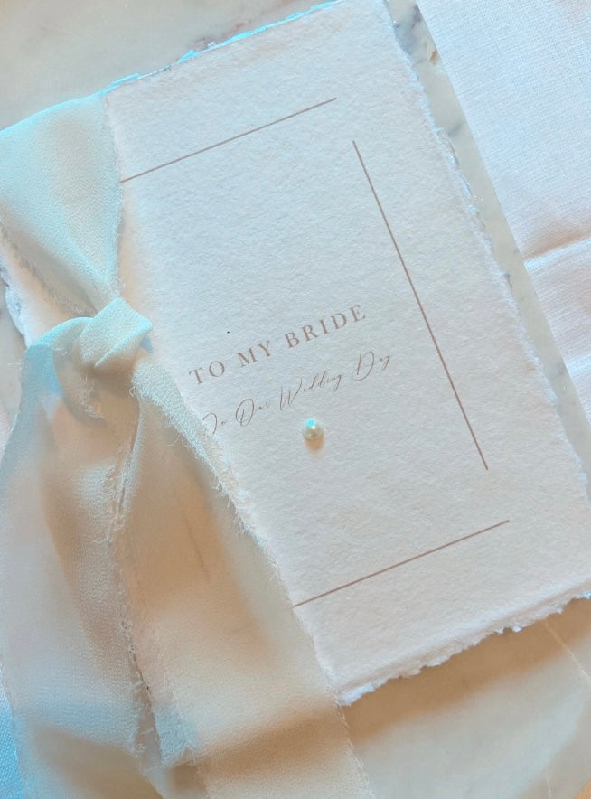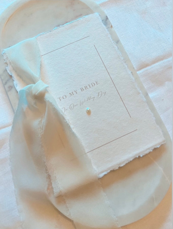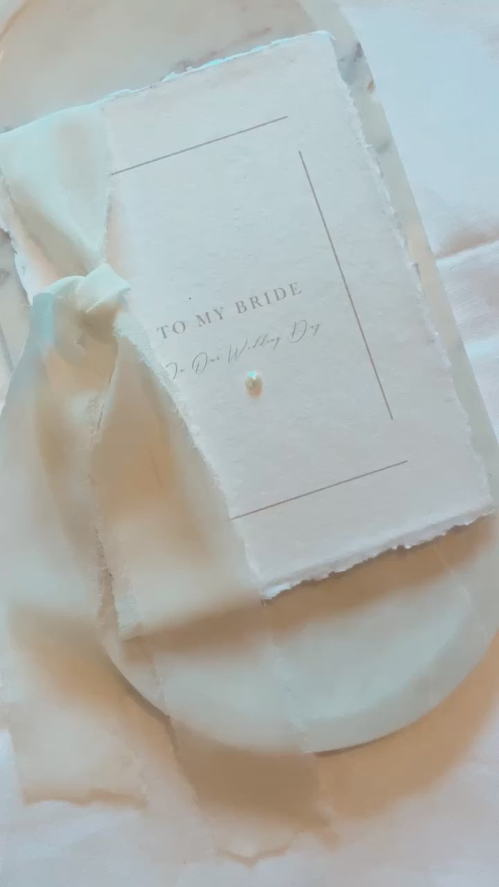 Luxurious Wedding Day Card for your Bride to be. Made on Cotton Rag Paper, with a delicate Pearl detail, finished with a Chiffon Ribbon Bow