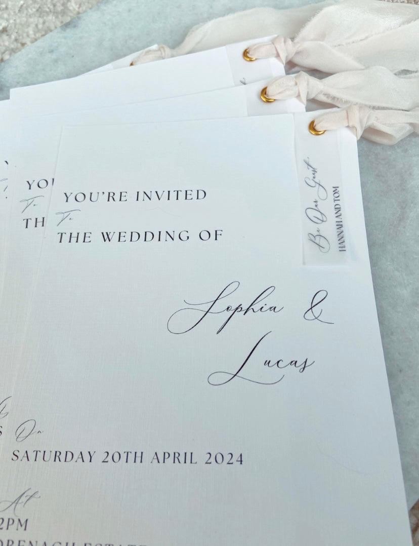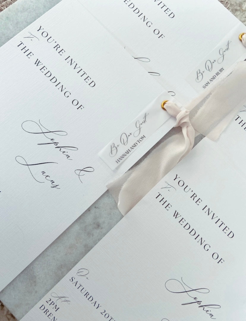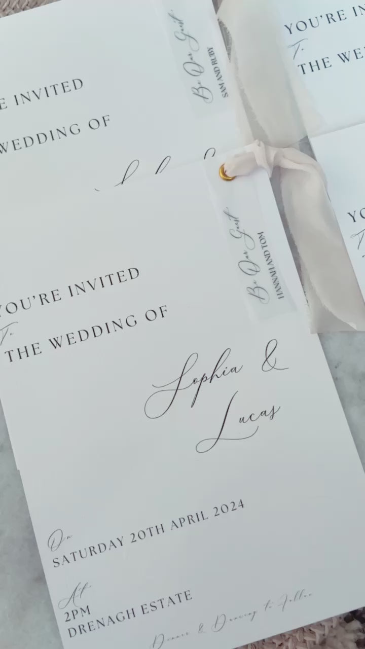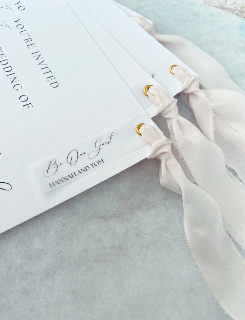 Luxury Wedding Invitation with Vellum Guest Names finished with a Silk Ribbon Tie
