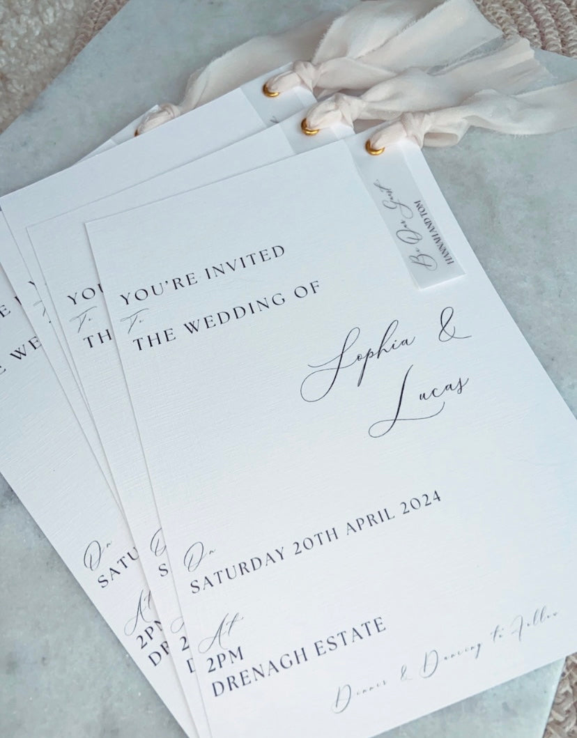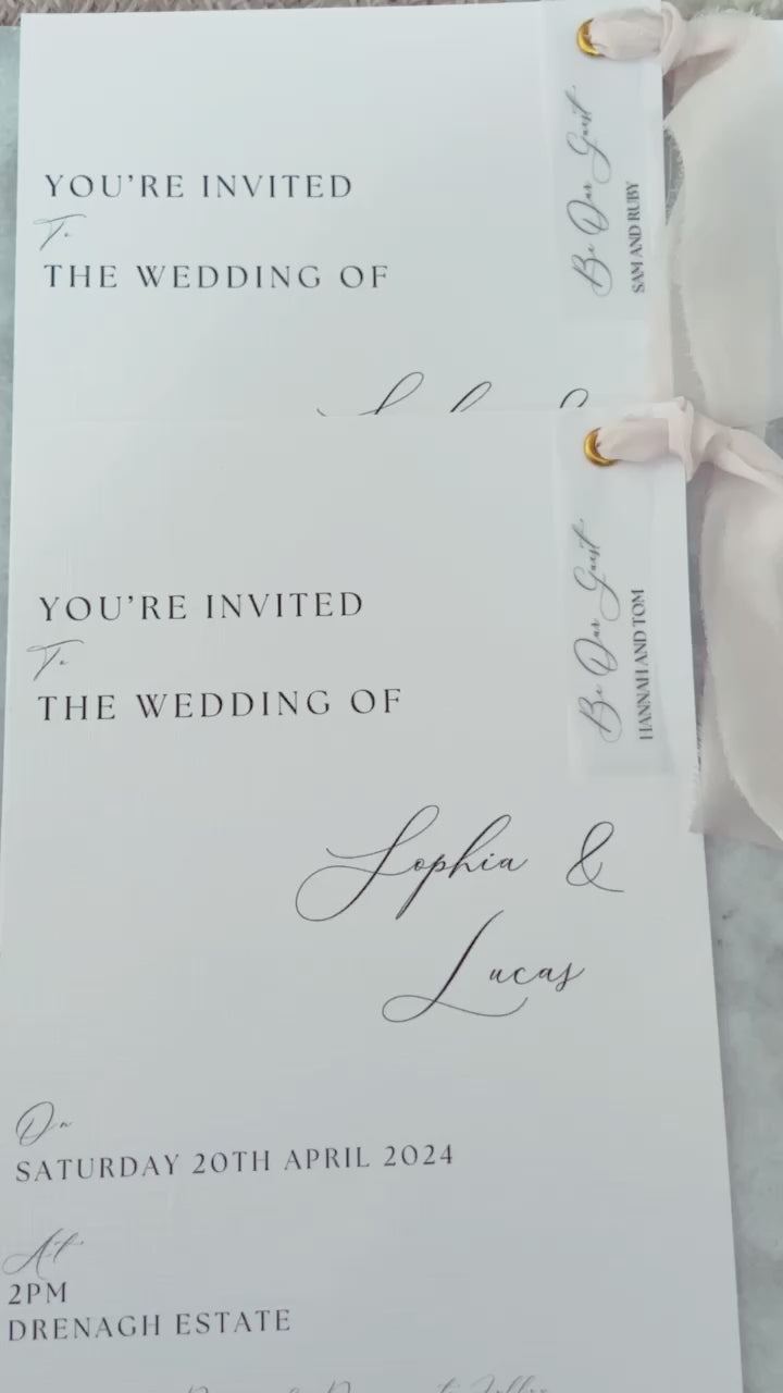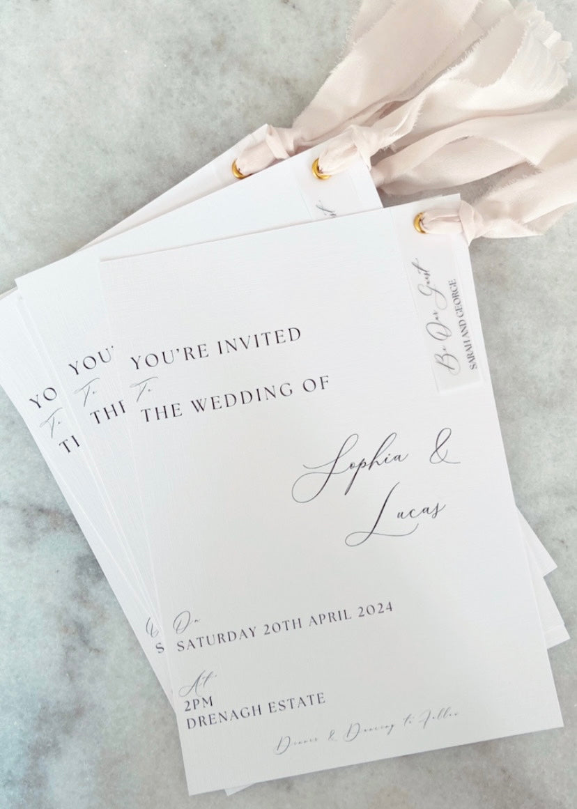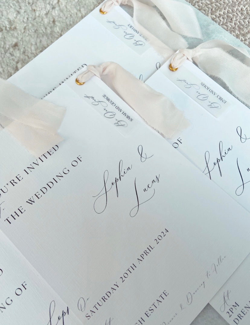 Luxury Wedding Invitation with Vellum Guest Names finished with a Silk Ribbon Tie