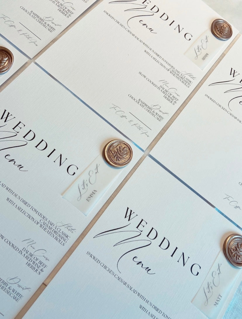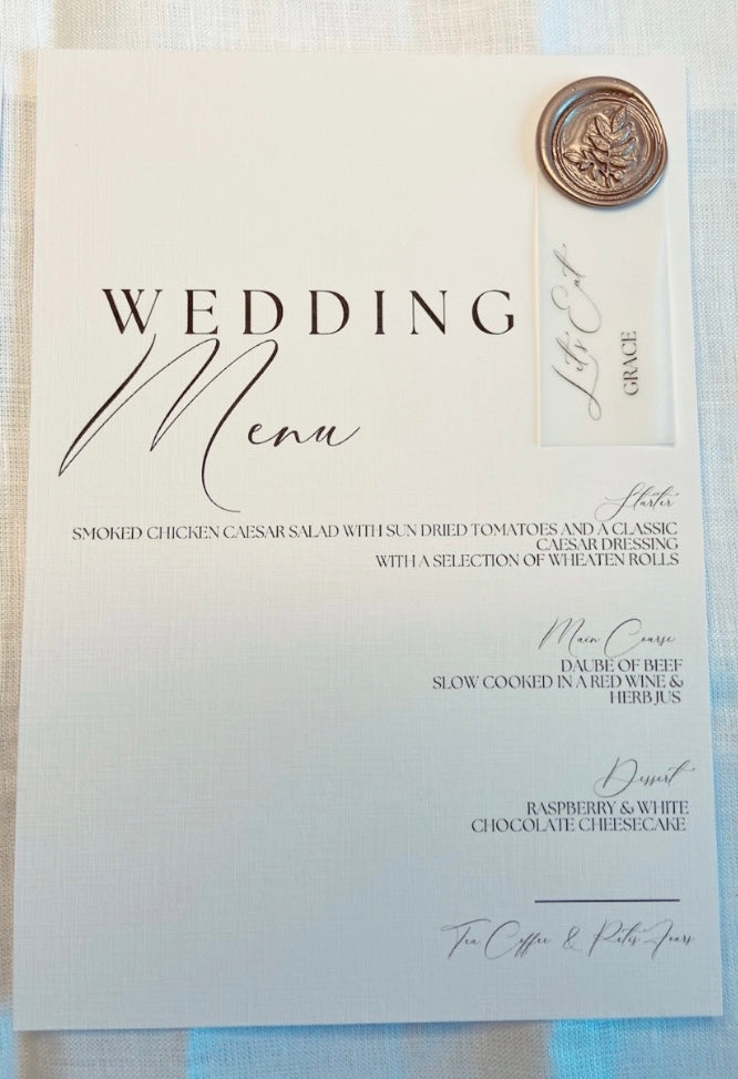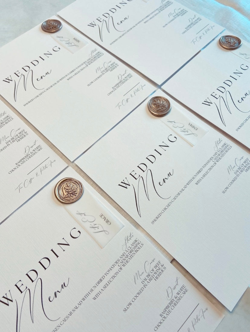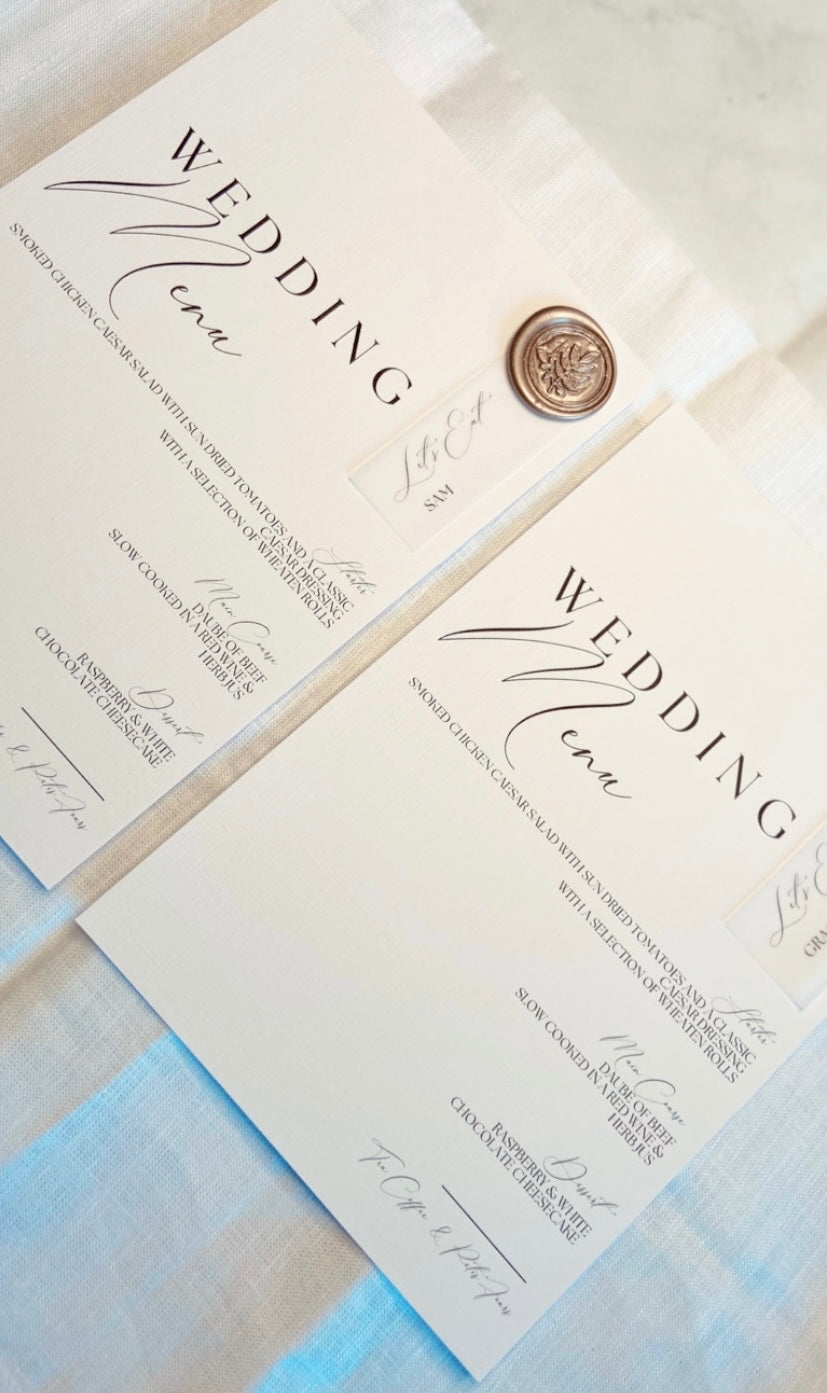Luxurious Wedding Menu on Linen Cardstock with a Wax Seal, finished with a Vellum Place Name