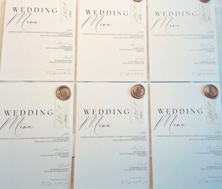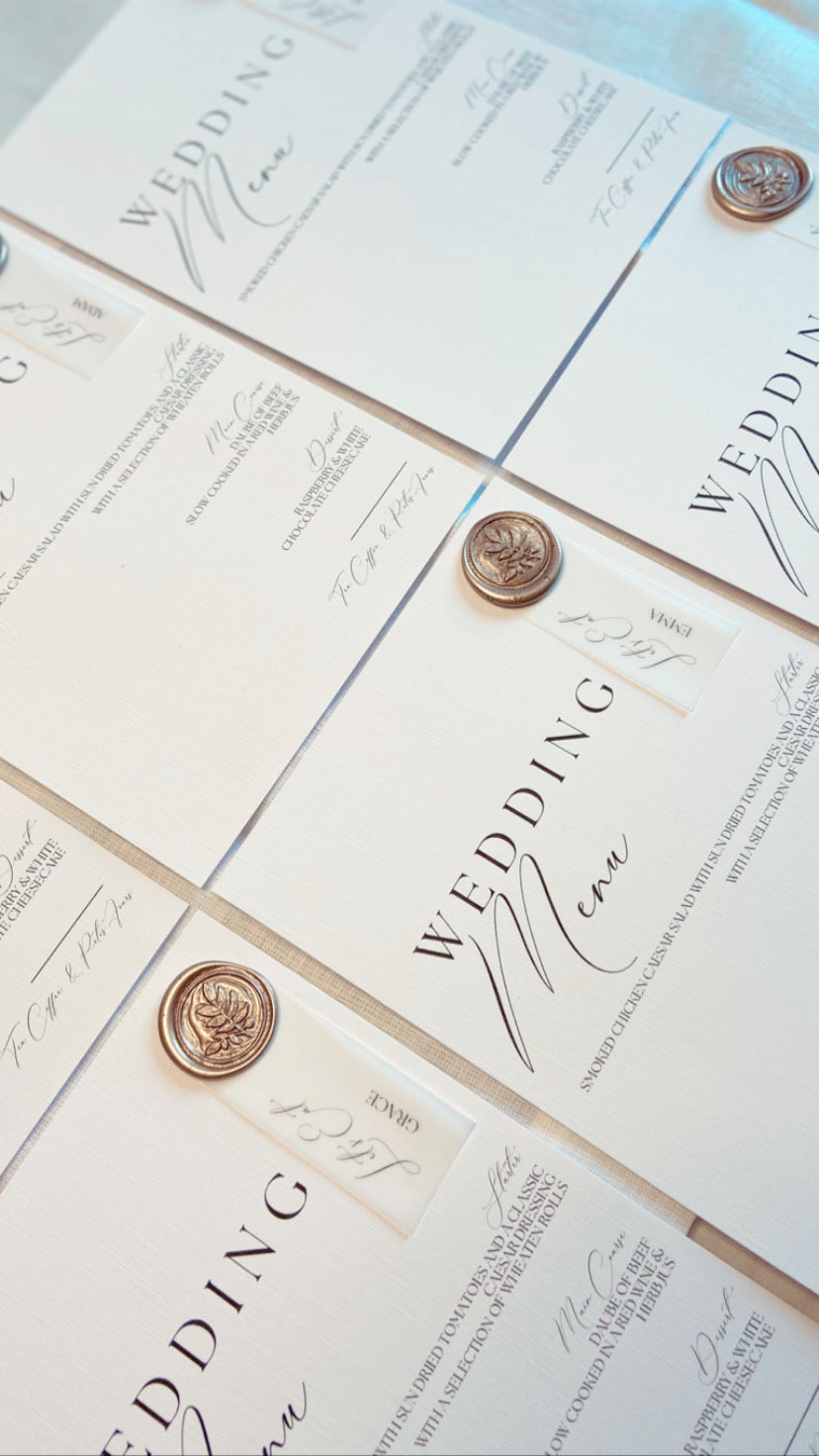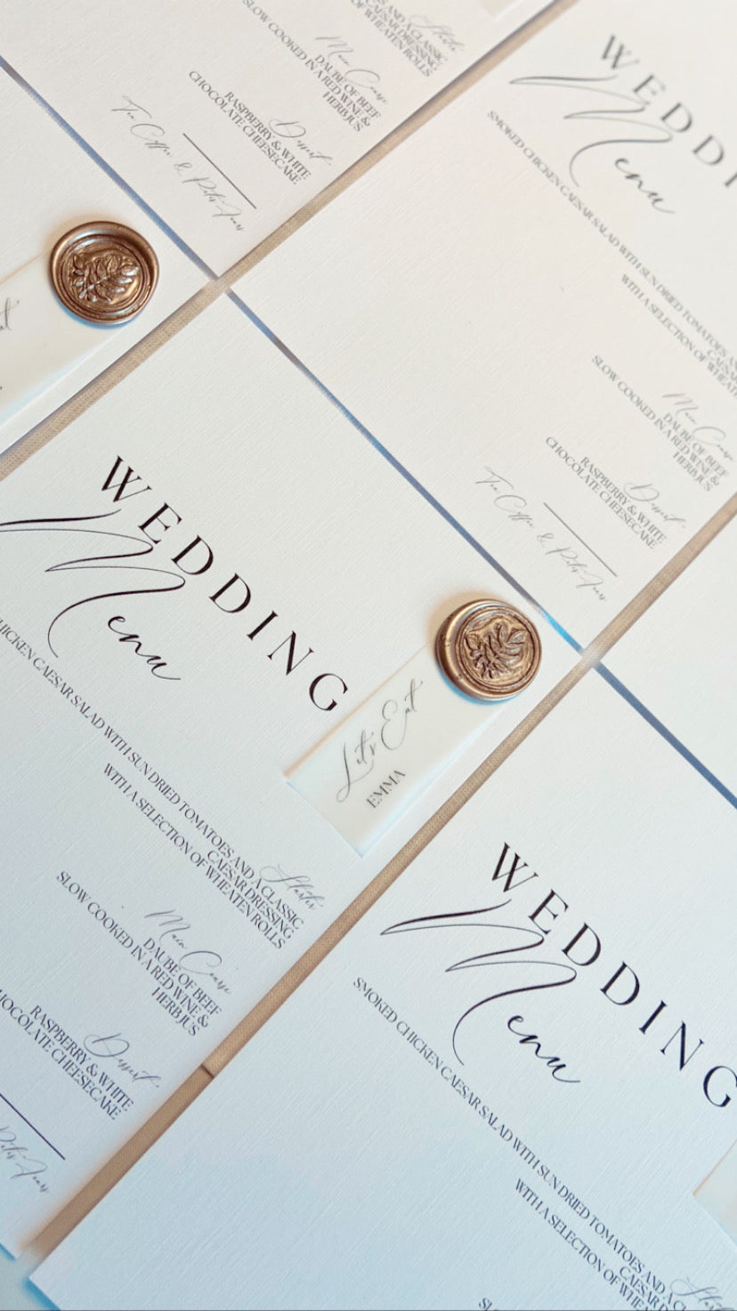 Luxurious Wedding Menu on Linen Cardstock with a Wax Seal, finished with a Vellum Place Name